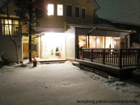 到了晚上用餐前,民宿前院已經積了厚厚一層白雪囉!小嘍囉還堆了一個小雪人呢!